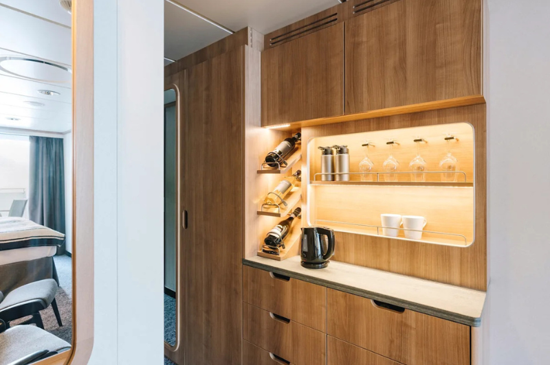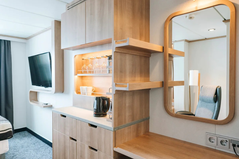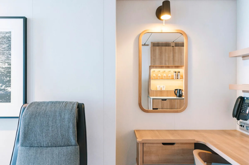 The rugged scenery will be reflected inside the ship through the use of Scandinavian materials from nature, such as granite, oak, birch, and wool that invoke a relaxed and comfortable atmosphere in which to unwind.