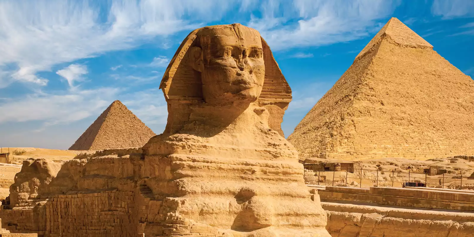 Egypt's most iconic and instantly recognisable tourist attractions where the Sphinx faces the sunrise and guards the pyramid tombs.