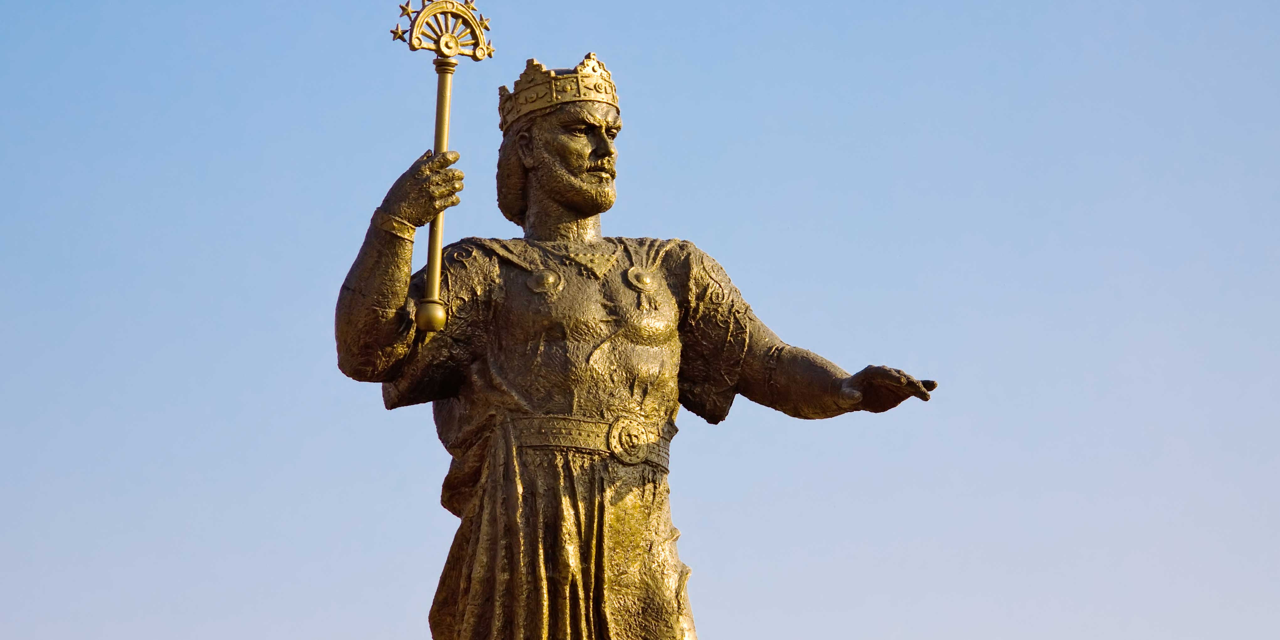 The giant statue is topped in gold and located in Dushanbe city's heart, at friendship square. It is 13 metres high with a surrounding arch that stands at 43 metres with a golden crown at the top. The seven-star sceptre he is holding represents one of the many Tajik legends and the two lions on either side of the arch believed to be related to Asiatic lions.